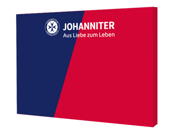 Die Johanniter-Stoffwand besteht aus einem speziellen Stoff, der einen sehr hohen elastischen Anteil hat und daher beim Zusammenbauen auf dem Gestell bleiben kann. Befestigt wird der Stoff einfach mit robustem Klettverschluss rund um die Scheren-Stoffwand – vorne und auch an den Seiten.
