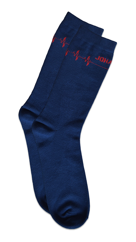 Herren Business-Socken in Dunkelblau mit Johanniter Schriftzug und EKG-Linie in Rot.