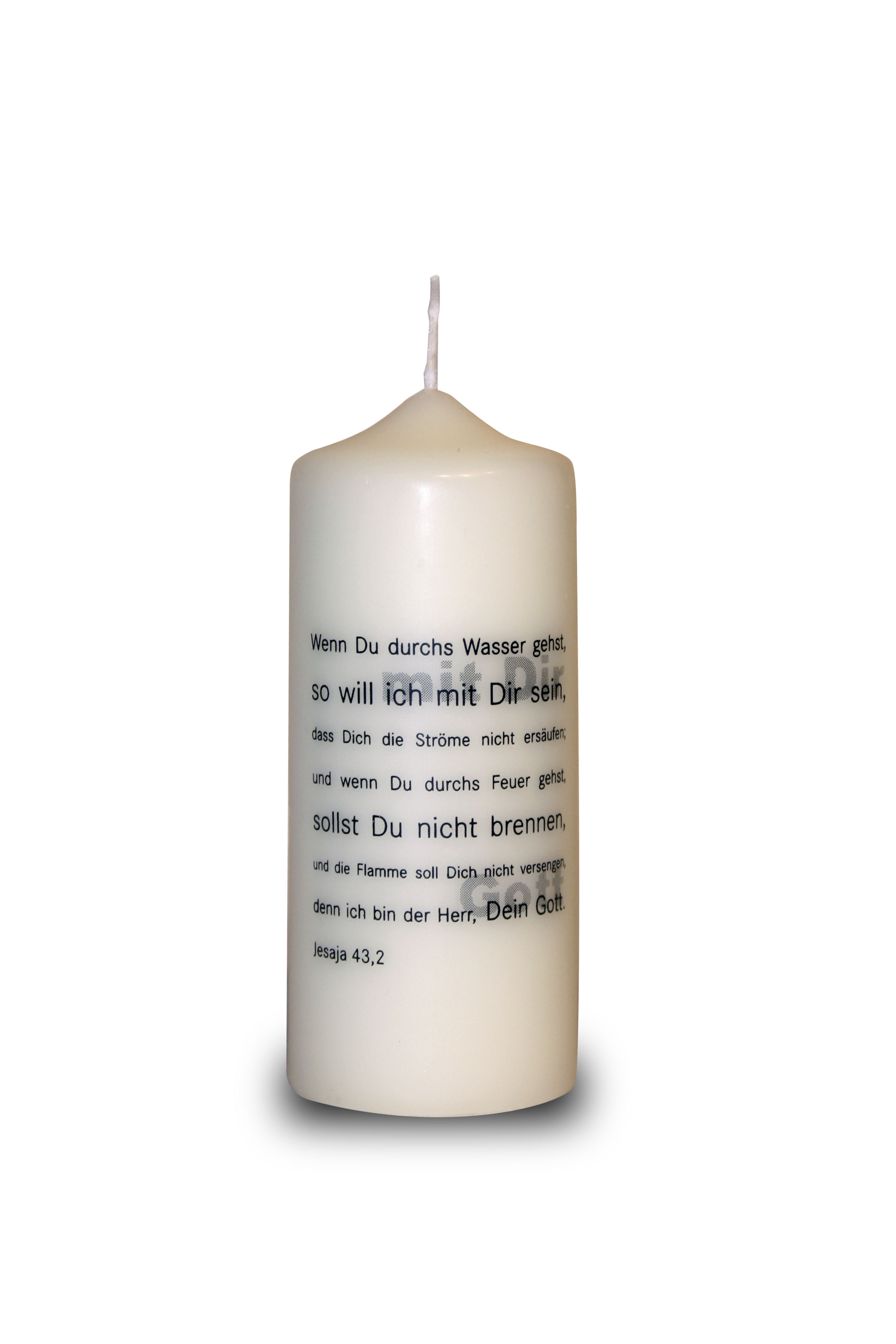 Die elfenbeinfarbene Stumpenkerze ist auf der Vorderseite mit einem Folienaufdruck des Wappens der Notfallseelsorge verziert, die Rückseite zeigt den Jesajatext 43,2. Die Kerze ist in einem klaren Zellufanbeutel verpackt.