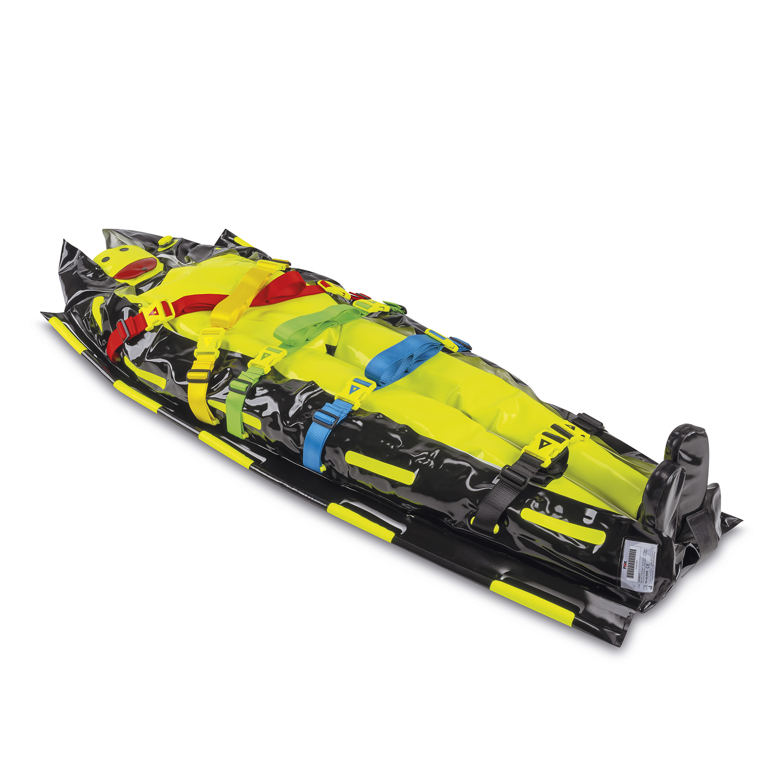 Mit der PAX Mummy-Mat Vakuummatratze haben wir uns an der Körperform orientiert und diese als ein Übergroßes „V“ geformt. Das „V“-Übermaß ermöglicht aufgrund der größeren Spannweite ab dem Becken eine verbesserte Sicherung des Patienten. Die Vakuummatratze kann über die Seiten hinaus um den Patienten anmodelliert werden. Mit Hilfe der farbcodierten Gurte wird der Patient gesichert.