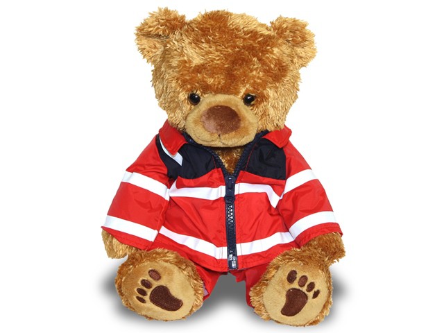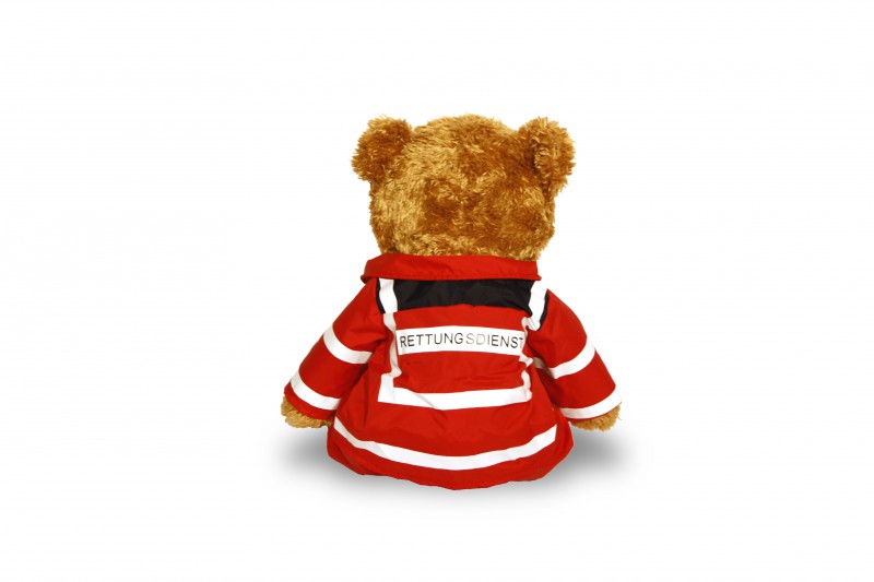 Teddys trocknen Tränen: Flauschig weicher Plüschteddybär in Rettungsdienstuniform als guter Zuhörer und stiller Tröster. Die rote Jacke ist mit Schriftzug und weißen Streifen versehen.