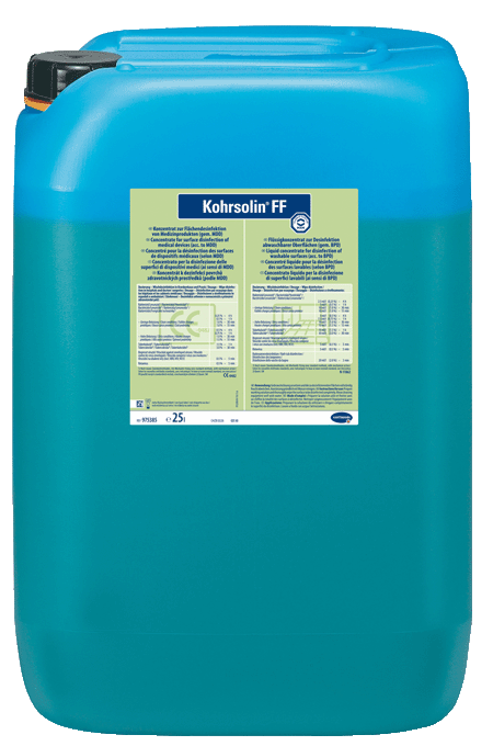 Beachten Sie unsere Rabattsätze für Johanniter. Wir beraten Sie gerne 06033/9170 802 Kohrsolin® FF Flächen-Desinfektionsreiniger für formaldehydfreie Kurzzeit-Desinfektion sehr gute Reinigungsleistung umweltschonend aufgrund geringer Wirkstoffanteile Anwendungsgebiete Für die Anwendung auf allen Oberflächen in Risikobereichen. Ferner hervorragend geeignet für den Einsatz in zentralen und dezentralen Dosiergeräten. Zur täglichen prophylaktischen reinigenden Desinfektion aller wasserbeständigen Oberflächen in allen hygienerelevanten Bereichen im Gesundheitswesen und in der Industrie und für gezielte Desinfektionsmaßnahmen, die ein erweitertes Wirkungsspektrum (z.B. Einsatz eines viruziden Produktes) erfordern. Charakteristik breites Wirkungsspektrum inklusive Viruzidie wirksam gegen Clostridium difficile-Sporen gute Reinigungsleistung gute Materialverträglichkeit angenehmer Geruch rückstandsarm kompatibel mit dem BODE X-Wipes Spendersystem Wirkstoffe Glutaral 50 mg/g Benzyl-C12-18-alkyldimethylammoniumchloride30 mg/g Didecyldimethylammoniumchlorid 30 mg/g Wirkungsspektrum Bakterizid, levurozid, fungizid, C. difficile-Sporen, tuberkulozid, begrenzt viruzid (inkl.HBV, HIV, HCV), viruzid, MNV, Adeno-,Polyoma- und Rotavirus. Listung VAH, CE-Kennzeichnung gemäß Medizinproduktegesetz (MPG), IHO-Viruzidie-Liste. Anwendung und Dosierung Kohrsolin FF wird als Konzentrat geliefert. Verpackungseinheit 40ml Dosierbeutel: 125 Stück zum Netto-Einzelpreis von 0,5033€ pro Beutel 5-Liter Kanister: 1 Kanister zum Netto-Einzelpreis von 50,90€ pro Kanister 25-Liter Kanister: 1 Kanister zum Netto-Einzelpreis 232,66€ pro Kanister 200-Liter Fass: 1 Fass zum Netto-Einzelpreis von 1.977,33€ pro Kanister
