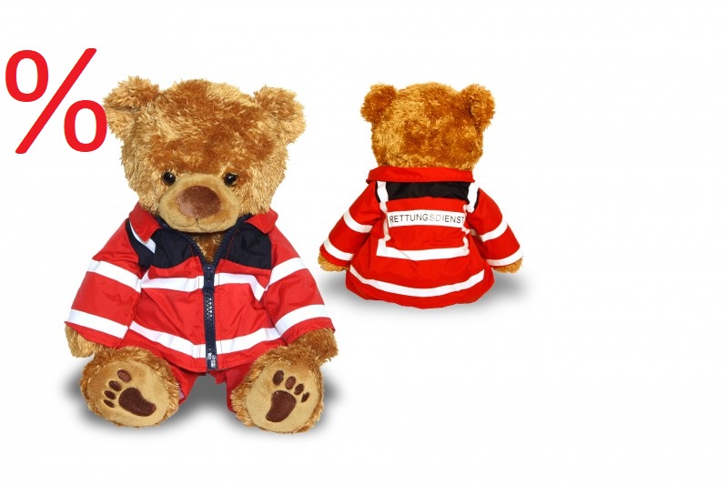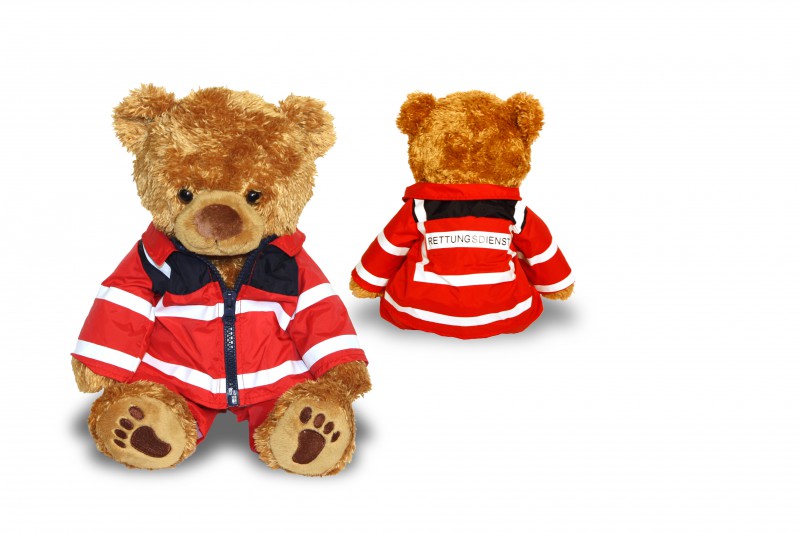 Teddys trocknen Tränen: Flauschig weicher Plüschteddybär in Rettungsdienstuniform als guter Zuhörer und stiller Tröster. Die rote Jacke ist mit Schriftzug und weißen Streifen versehen.
